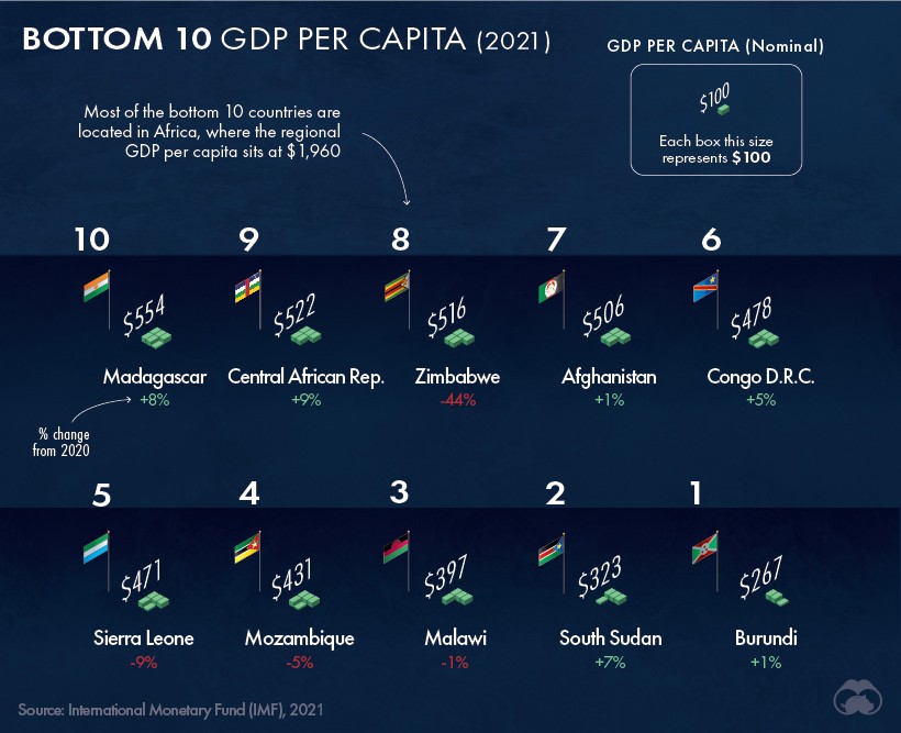 The difference between the GDP per capita income of the richest and the poorest nation is 497 times based on 2021 data. The average population was 369 million residents for the top 10 wealthiest economies vetted by GDP per person as of April 2021. GDP per Capita is one of the best measures of a countrys wealth as it provides an understanding of how each countrys citizens live on average by measuring.